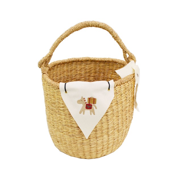 ラタンハウスオリジナル 刺繍フラッグバスケット UMA-BLUE *柄『 黒馬×青 』 *フラッグサイズ『 L 』 *シーグラス 一本手 ぽってりかごM ラタンハウスオリジナルデザイン、自社製造の刺繍フラッグ、旗。 刺繍の絵柄はお馬さんがトランクバスケットを背負ったかわいらしいデザイン。 ブラックホース×ブルーの配色。 『 Rattanhouse Kagoya 』刺繍タグ付きです。 刺繍フラッグをハトメとリボンで かごの編み目の隙間に通して取り付けました。 結び目をほどくことで取り外すことができ、 取りつける位置やリボンを変えたり、 お手持ちのかごに付け替えていただくことも可能です。 他の刺繍フラッグや他の種類のかごもございます。 -フラッグサイズ- W15×H25cm 素材 綿100% 帆布 日本製 *フラッグは、帆布の生地を切りっぱなしにしております。 初回発送の際は、ほつれ止めを施していますが、 お使いいただくうちにほつれてくる場合がございます。 *フラッグのお洗濯はお控えください。 -バスケットサイズ- 約Φ22×H19(持ち手H30)cm 素材 シーグラス ベトナム製