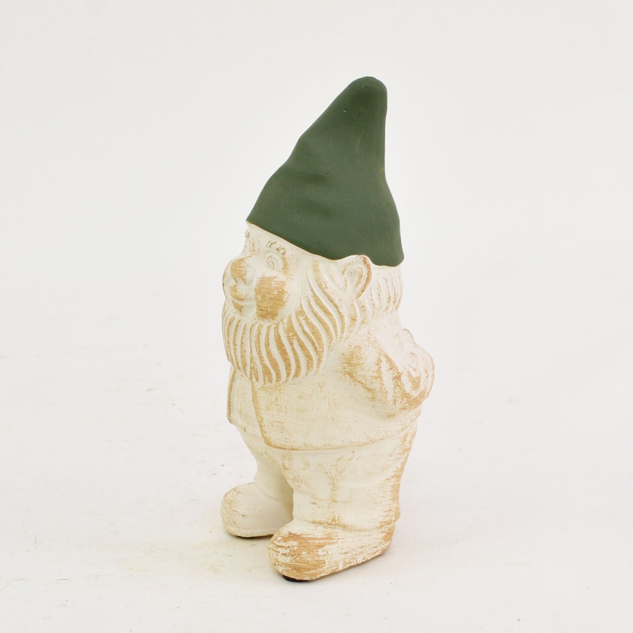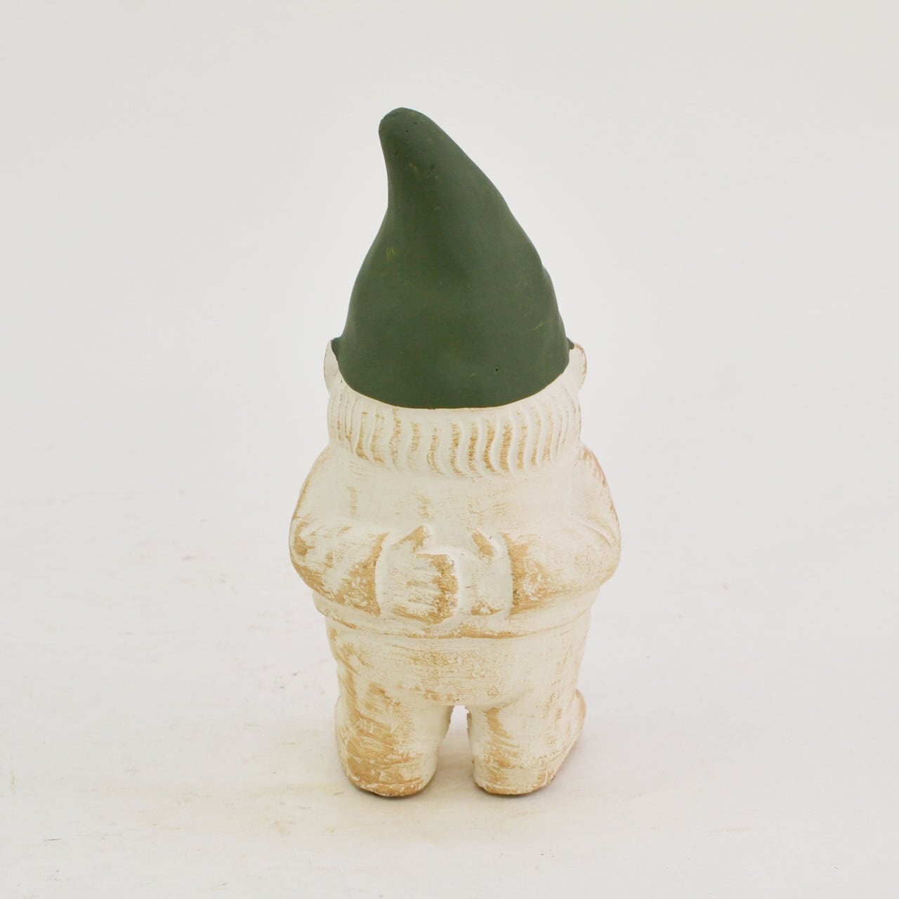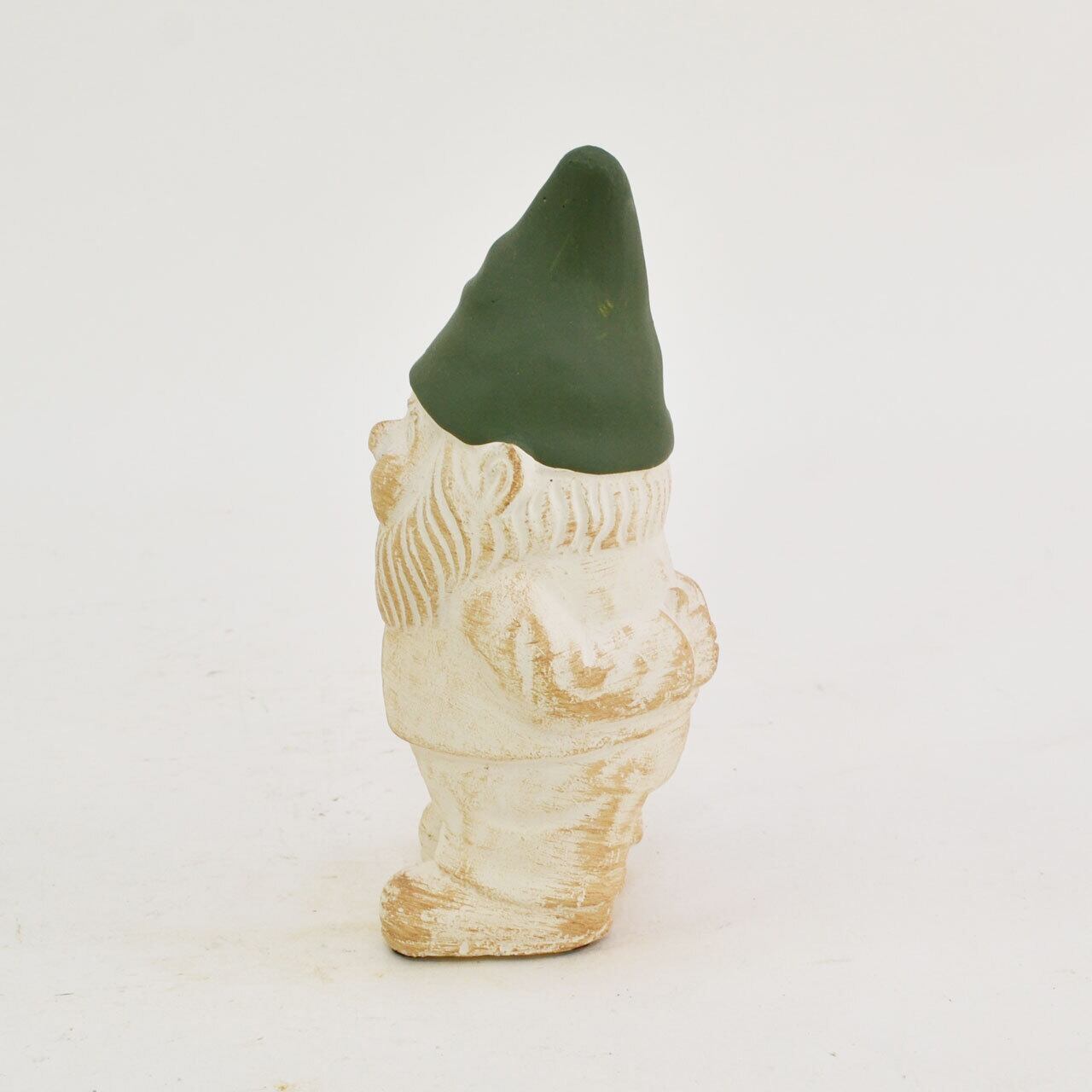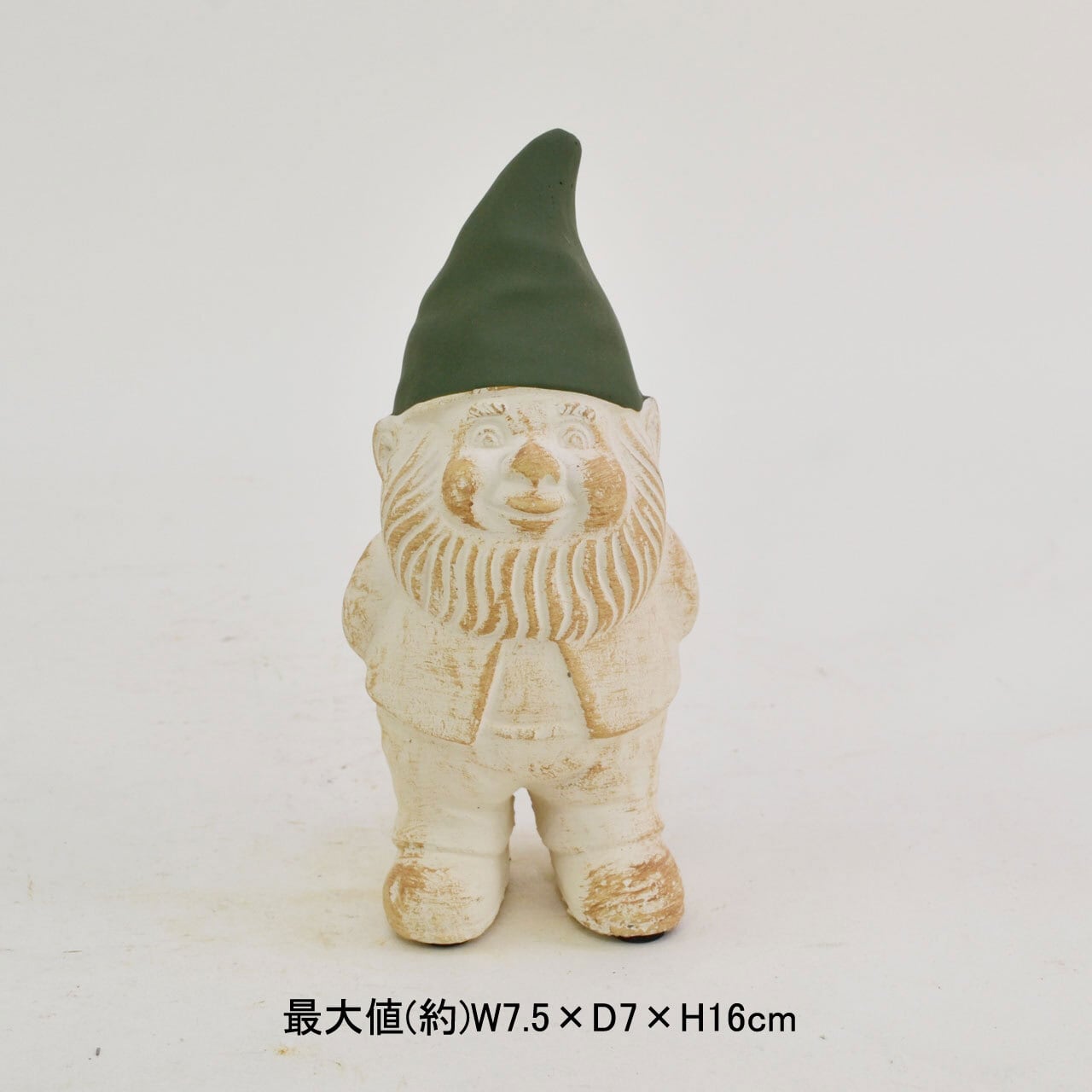 緑色の帽子をかぶった愛らしい表情のこびとさん、小人のオブジェ。