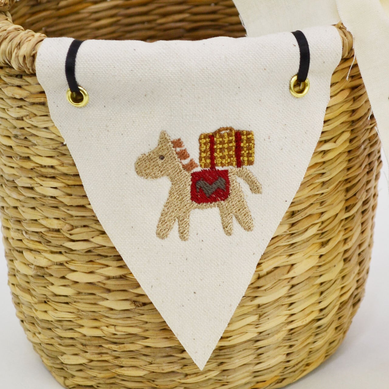 刺繍の絵柄はお馬さんがトランクバスケットを背負ったかわいらしいデザイン。
